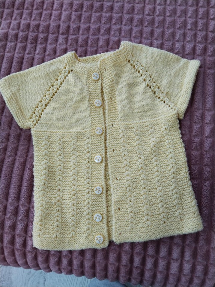 Pastel sarı renkte, kısa kollu, bol kesim örgü hırka, yumuşak örme kumaştan, bohem tarzında.