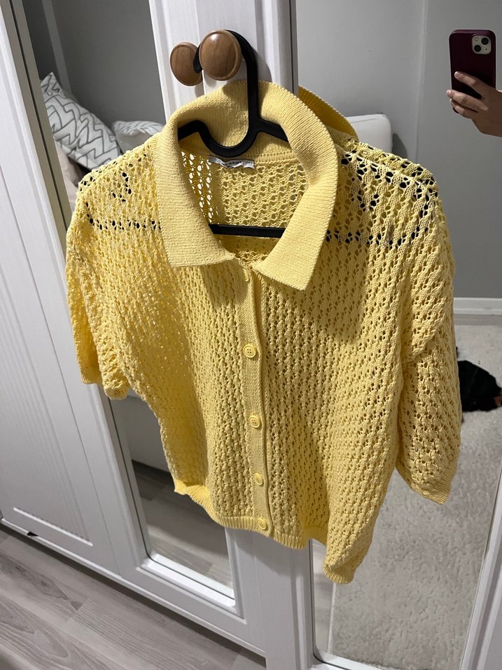 Sarı renkli, kısa kollu, yakalı ve midi boyda örgü hırka. Rahat kesimi ve sade dokusuyla günlük kullanıma uygundur.