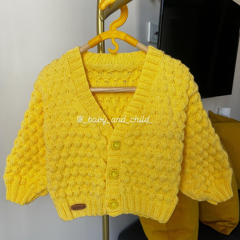 Sarı renkli, örgü kız çocuk hırkası bol kesim ve uzun kolludur. Yumuşak örme kumaştan yapılmıştır ve desensiz, normcore tarzındadır.
