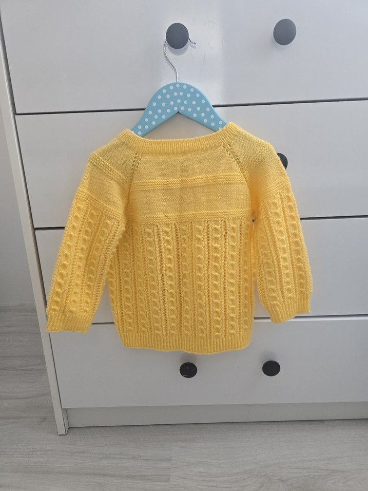 Açık sarı renkli, uzun kollu ve bol kesim örgü kız çocuk hırkası. Modern klasik stilde, desensiz dokulu örgü detayları bulunur. 2 yaş için uygumdur iki kol altı 30 uzunluk 36 bebe yünü ile örülmüştür kusursuz hatasız örgü
