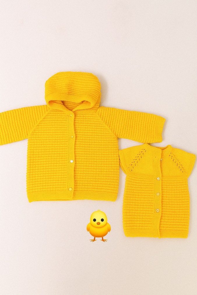 Sarı renkli, uzun kollu kapüşonlu hırka ve kısa kollu yelekten oluşan örgü kız çocuk seti.