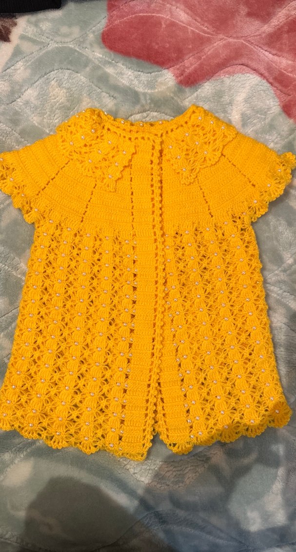 Rengarenk sarı örgü kız çocuk kısa kollu hırka, bohem tarzda bol kesim ve detaylı dantel desenli.