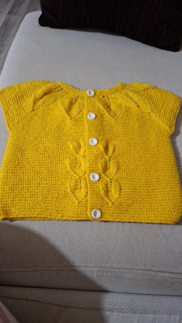 Renkli sarı örgü kısa kollu, bol kesim, bohem tarzda yaprak desenli düğmeli kız çocuk hırkası. simli