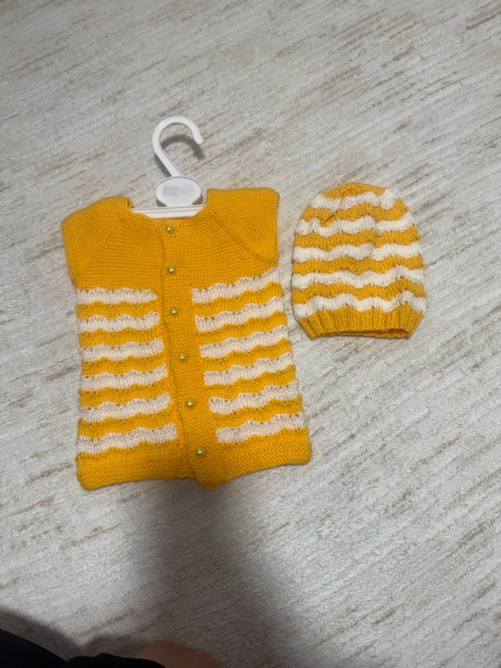 Sarı renkli, beyaz dalga desenli, örgü kız çocuk süveter ve bere takımı. Fitted kesim ve kolsuz tasarıma sahiptir.