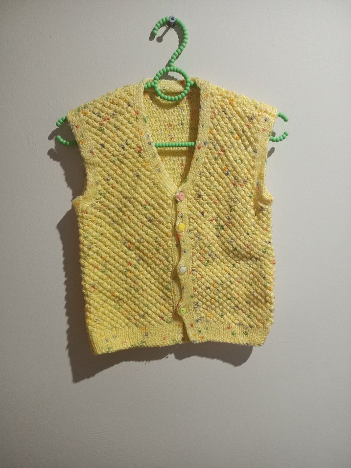 Sarı, örgü, kolsuz yelek, bol kesim ve yuvarlak yaka ile bohem ve retro tarzlara uygundur.