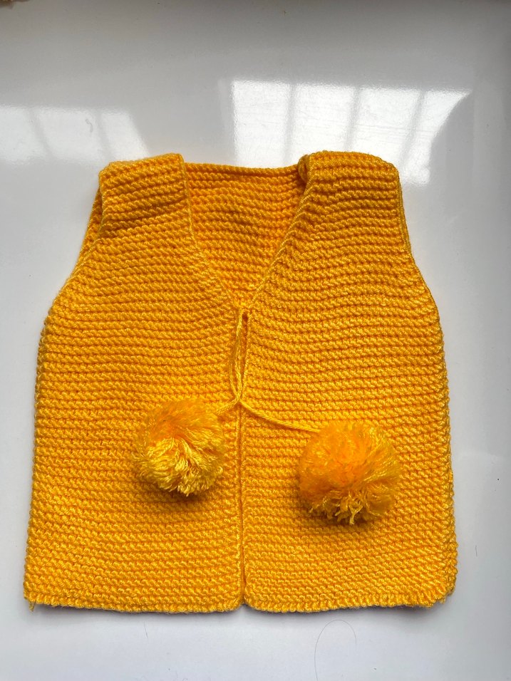 Sarı ponponlu kız bebek yeleğidir. Erkek bebekler içinde kullanılabilir. Son fotoğrafta göründüğü üzere küçük belli belirsiz ipten kaynaklı bir defosu vardır. Büyük ihtimalle yıkanırsa geçer. İstediğiniz boyda ve renkte örebilirim. ÖLÇÜLERİ Boy: 26 cm En:24 cm 0-4 aylık bebekler için uygundur.