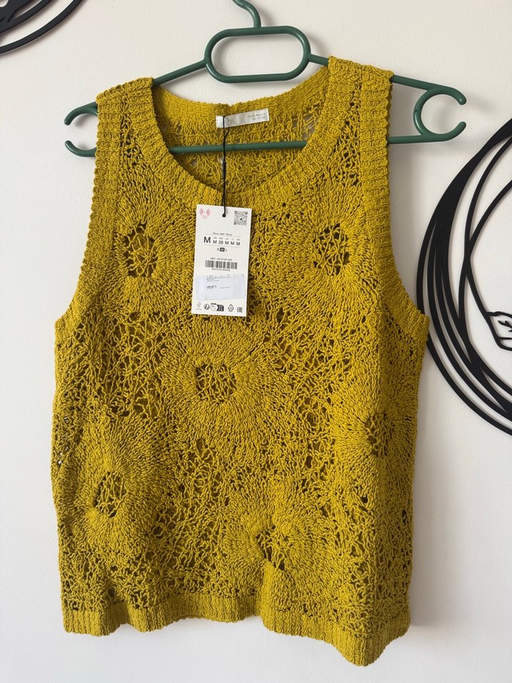 Sarı örme kolsuz kadın süveter, bol kesim ve yuvarlak yaka ile. Kısa boyda, baskılı desenli, günlük kullanıma uygun bohem tarzda. Zara m beden