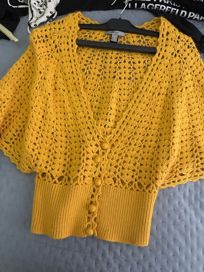 Sarı renkli, uzun kollu, bol kesim örgü hırka. Parlak dokusu ve düğme detaylarıyla günlük kullanıma uygun bohem tarzda.