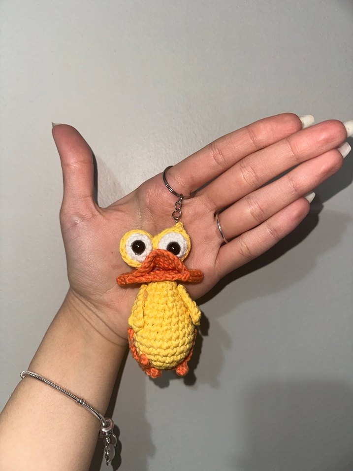 Renkli sarı örgü ördek figürlü anahtarlık, büyük gözleri ve turuncu gagasıyla bohem tarzda eğlenceli bir dokunuş katıyor.