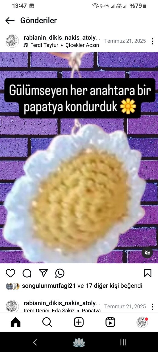 Pastel sarı renkte, örgü papatya detaylı anahtarlık, anahtarlarınıza bohem ve rahat bir hava katıyor.