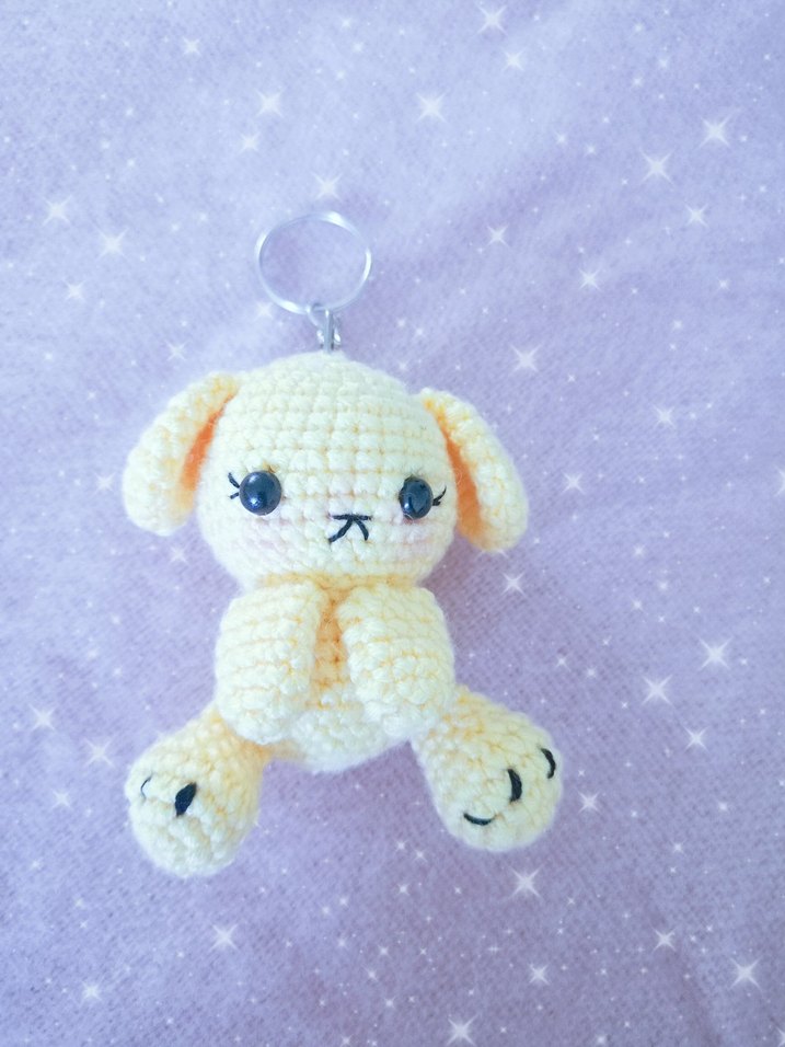 Pastel sarı renkli, örgüden yapılmış küçük hayvan figürlü peluş anahtarlık, sade ve rahat bir tarza sahip.