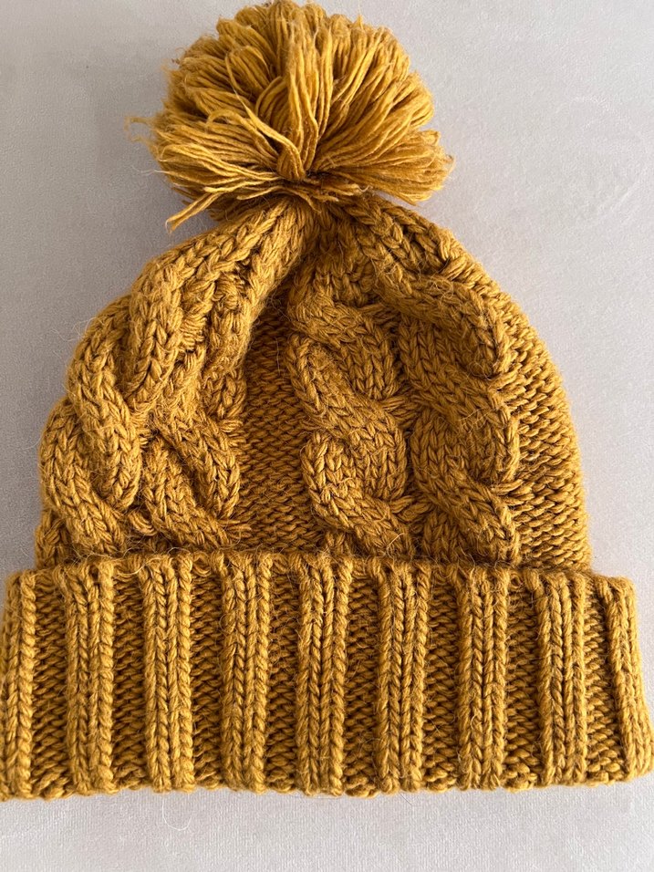 Sarı renkli, ponponlu örgü kadın bere. Sıcak tutan, rahat ve bohem tarzda tasarlanmıştır.