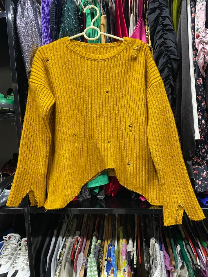 Sarı renkli, uzun kollu, salaş kesim ve bisiklet yaka kazak. Hiç kullanılmadı , deformesi yoktur. S-M beden uyumludur.