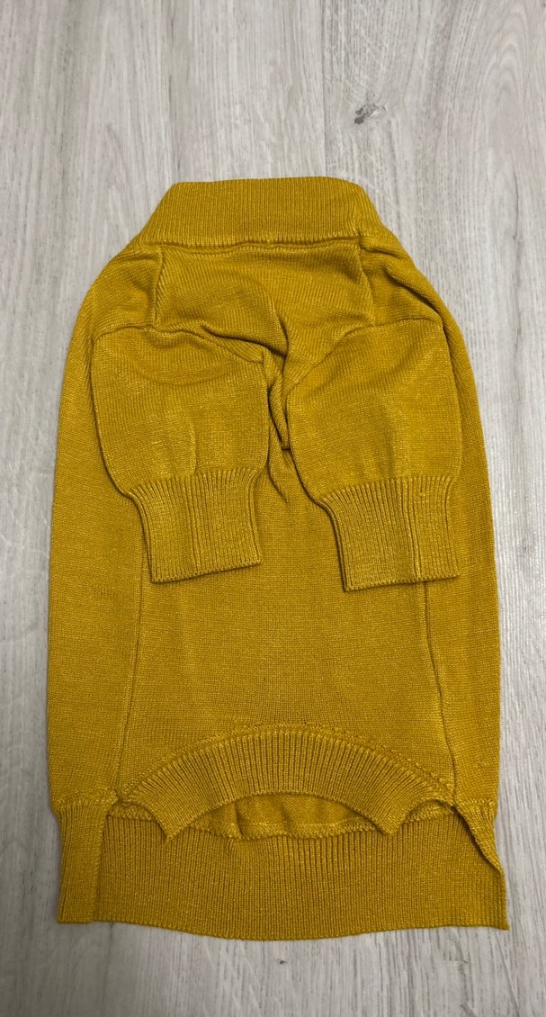Sarı örgü köpek kazağı, sokak stili ve düz desensiz tasarımı ile rahat bir kullanım sunar. Manşetleri sıkı oturur.