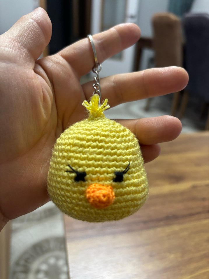 Sarı renkli, tığ işi örgüden yapılmış civciv şeklinde anahtarlık, metal halka ile kolayca takılabilir.