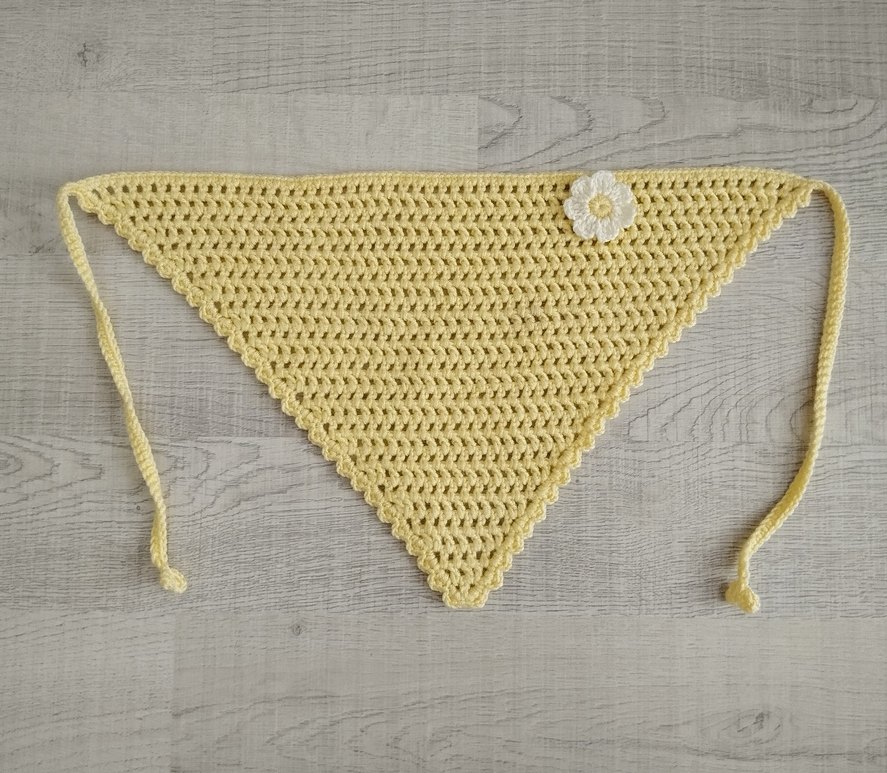 Açık sarı renkli, küçük beyaz çiçek detaylı örgü üçgen saç bandı, rahat ve bohem tarz sunar. Kafa kısmı 40 cm'dir