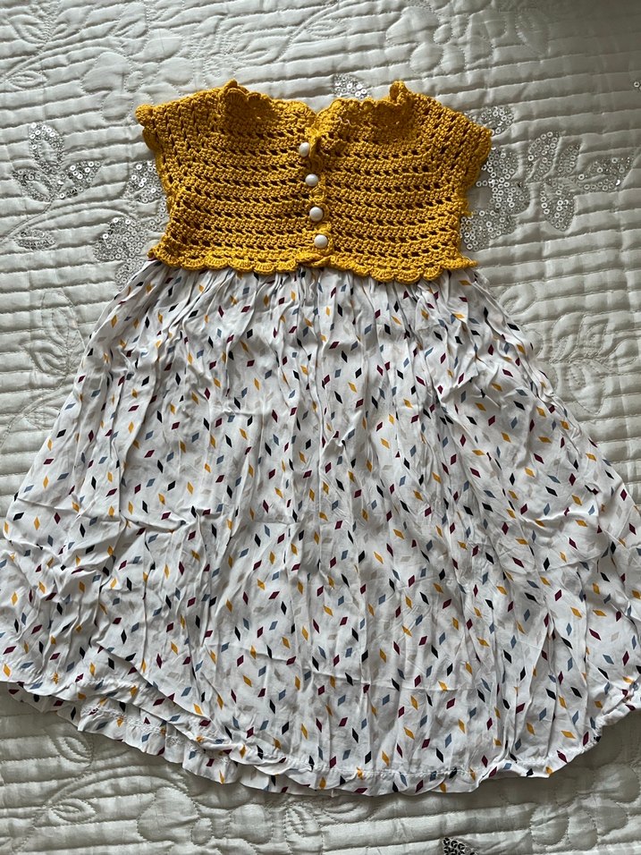Sarı örgü üstü düğmeli ve fırfırlı, altı desenli gri bol kesim kolsuz kız elbisesi. Bohem tarzda.