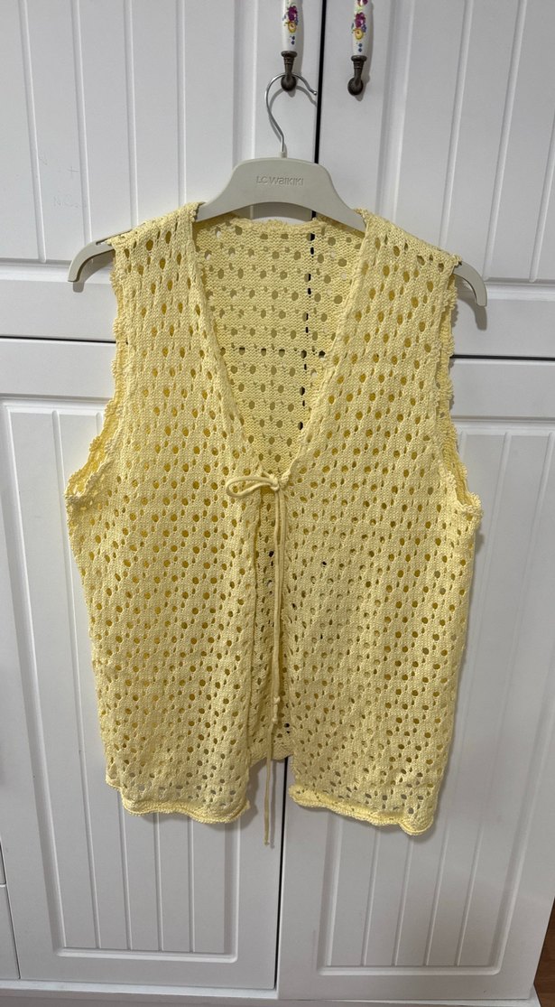 V yaka, bağcıklı, sarı renkli, örme, bol kesim ve kolsuz yelek. Rahat ve bohem tarzda, nefes alan dokuma ile.marka temsili