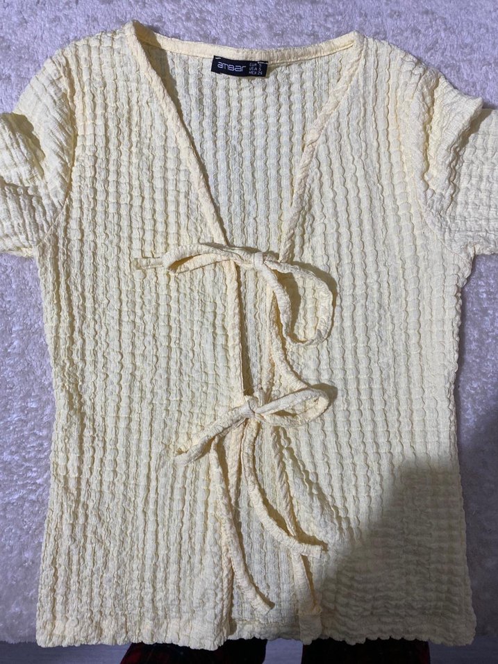 Sarı keten bluz, örgü dokusu ve V yaka ile strappy kısa kolludur. Önden bağlamalı, bohem ve rahat tarzda, günlük kullanıma uygundur.