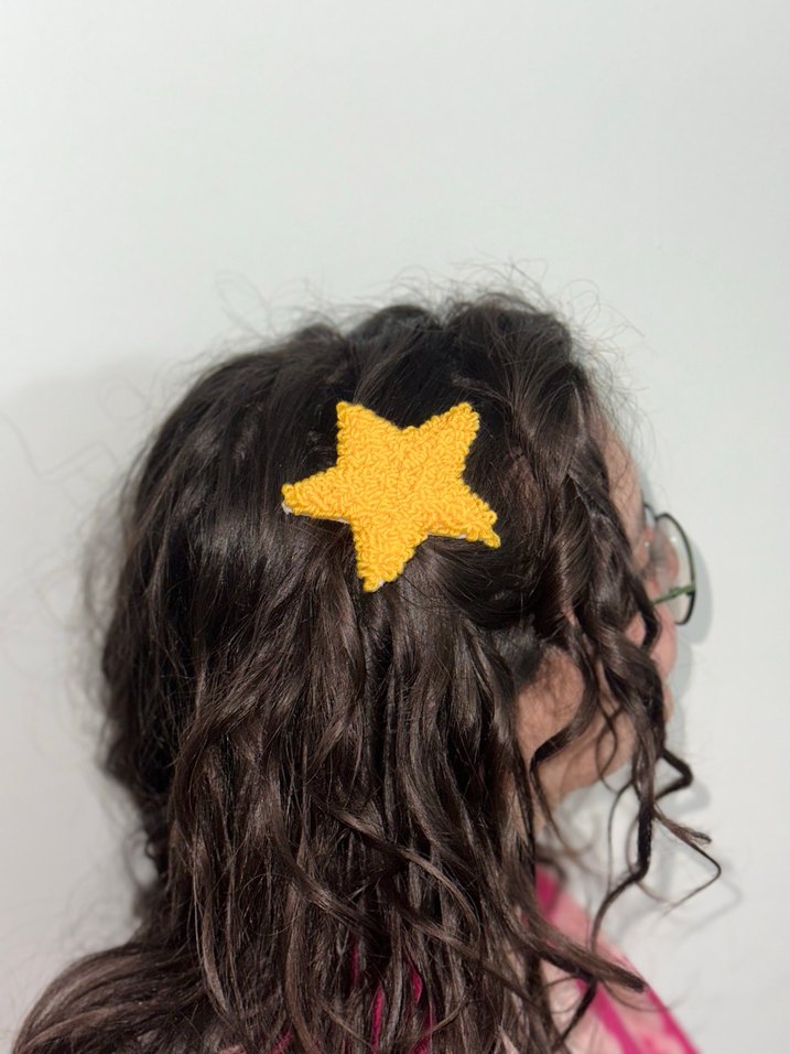 Parlak sarı renkte, örgüden yapılmış yıldız şekilli saç tokası, bohem ve rahat bir tarz sunar. istediğiniz renklerde sipariş üzerine de yapılır