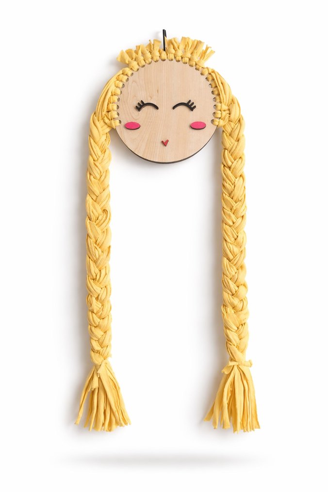 Ahşap yuvarlak yüzü ve uzun örgülü kumaş saçlarıyla pastel sarı duvar bebek süsü, mekana yumuşak ve neşeli bir hava katar. tokalarınız artık dagılmayacak ve düzenli olacak