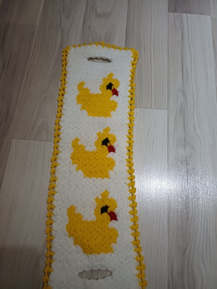 Renkli ördek desenli, kolay tutuş için kulplu sarı örme banyo süngeri. Yumuşak ve dekoratif. en 15 boy 50