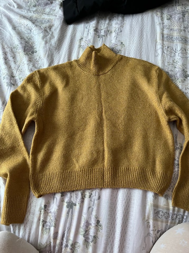 Sarı renkli, parlak görünümlü örme kazak. Boğazlı yaka, uzun kollu ve bol kesim, midi boyda rahat bir model.