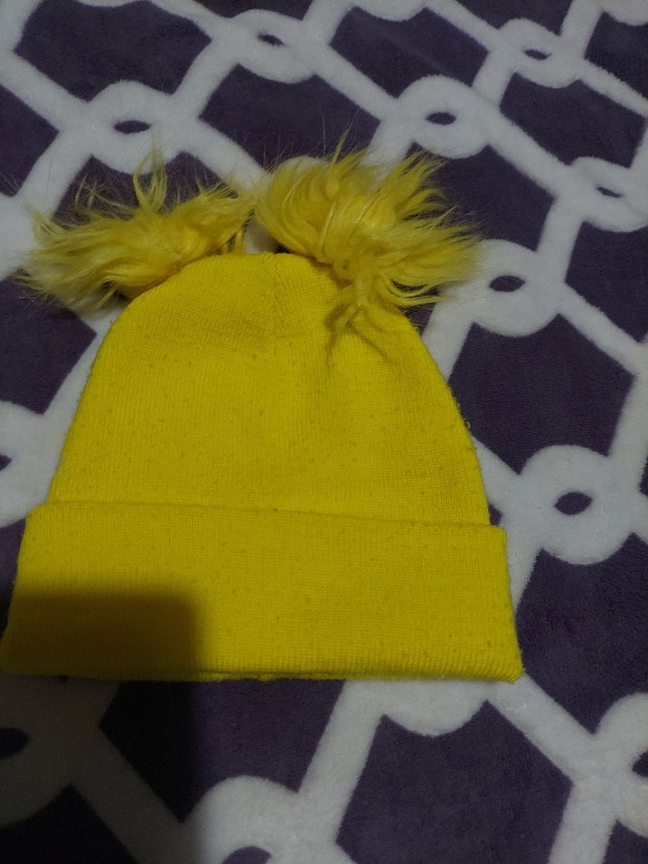 Sarı örme cocuk bere, yumuşak ve sıcak kumaş ile iki tüylü ponpon içerir, rahat ve renkli bir tarz sunar.