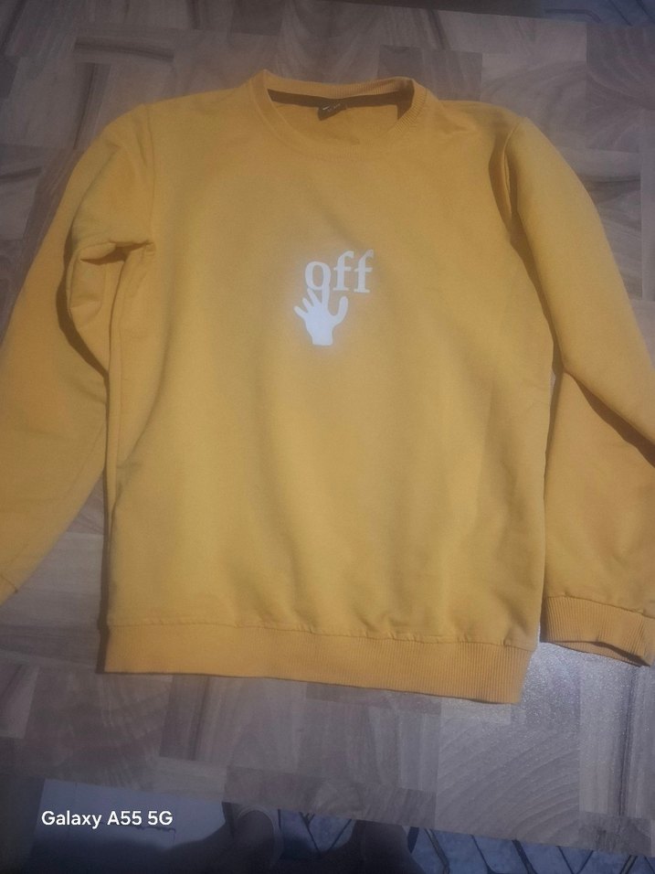 Yumuşak ve sıcak kumaştan, oversize kesim, yuvarlak yaka ve uzun kollu erkek sweatshirt. Üzerinde 'off' yazılı baskı ve el figürü bulunur. Günlük rahat kullanıma uygun sarı renkli streetwear tarzı.