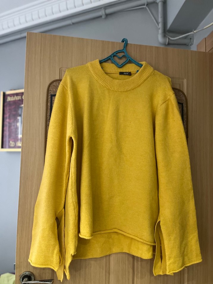 Sarı renkli, oversize kesim, uzun kollu ve bisiklet yaka kadın triko sweatshirt. Yumuşak örme kumaştan, rahat ve parlak görünümlü, gündelik kullanıma uygun.