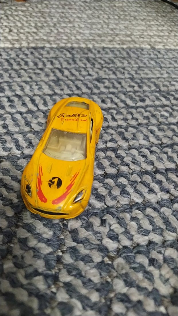 Sarı renkte, kaputunda siyah ve kırmızı alev detayları bulunan oyuncak araba. Şeffaf camları ve şık tasarımı vardır.