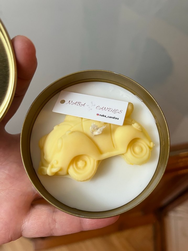 Yuvarlak kutu içinde pastel sarı oyuncak araba şeklinde mum, eğlenceli ve dekoratif bir detay sunar. ️
