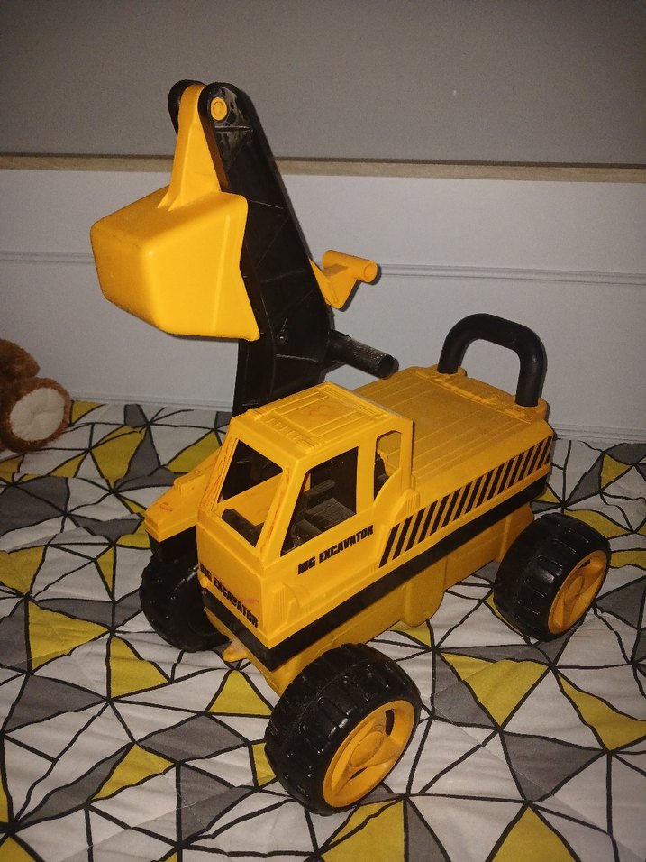 Hareketli kola ve büyük tekerleklere sahip, dayanıklı plastikten yapılmış renkli sarı oyuncak ekskavatör araba.