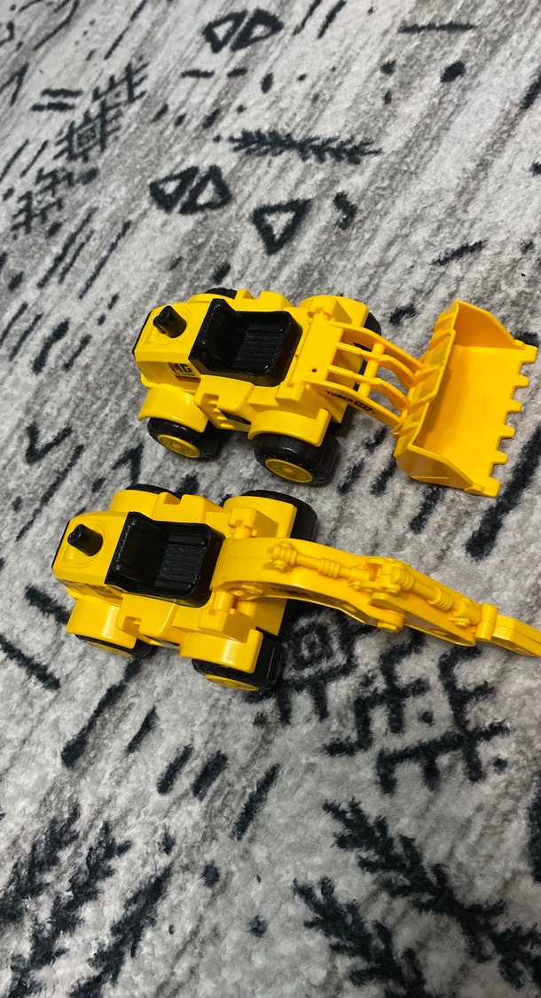 İki adet sarı oyuncak iş makinesi, dayanıklı malzemeden yapılmış, detaylı tasarım ve hareketli parçalar içerir. 2li alım Sıkıntısız