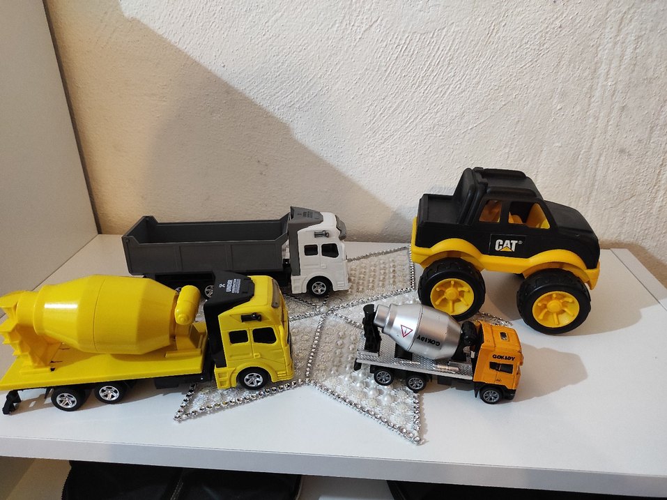 Sarı renkli oyuncak kamyonlar, Farklı inşaat kamyonlarından oluşur.