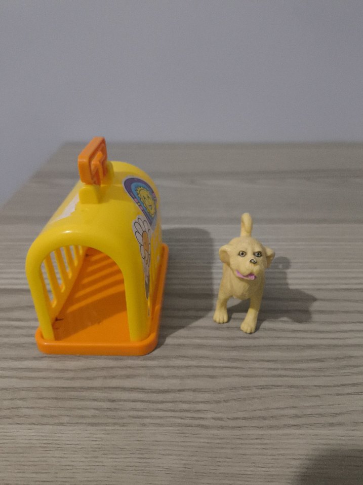 Renkli sarı oyuncak köpek ve turuncu tabanlı taşıma kutusundan oluşan set. Küçük köpek figürü ve kafes şeklinde kutu içerir.