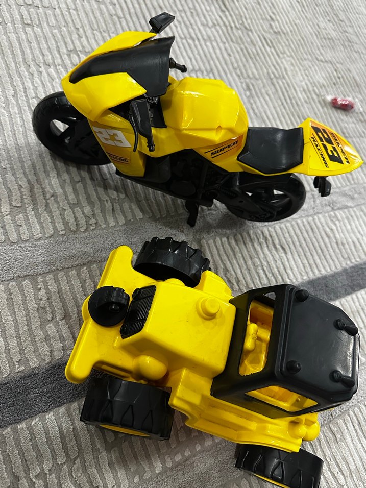 Sarı renkli oyuncak motorsiklet ve iş makinesi, dayanıklı plastikten üretilmiş detaylı tasarıma sahip. ️