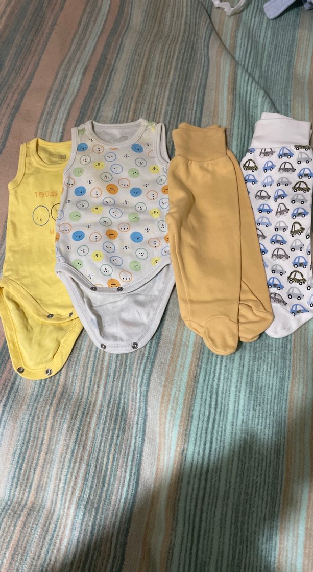 Sarı renkte, pamuklu ve askısız yakaya sahip, örme dokulu bebek body. iki zıbın ve 2 pijama fiyatıdır.