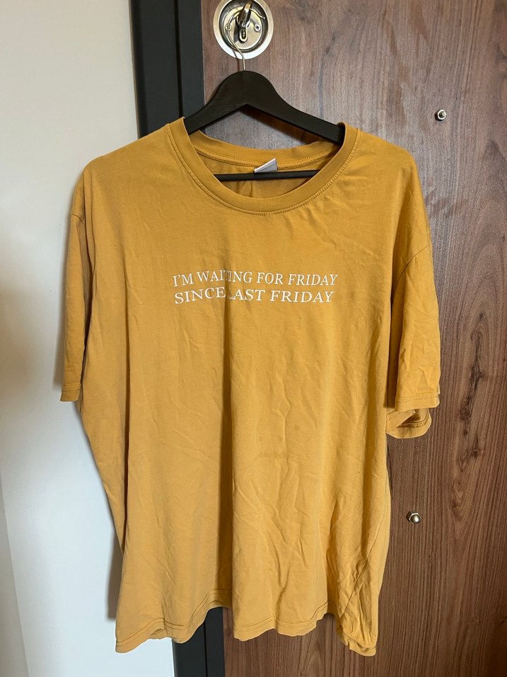 Sarı pamuklu tişört, bisiklet yaka ve kısa kollu. Gevşek kesim, parlak yüzey ve "I'M WAITING FOR FRIDAY SINCE LAST FRIDAY" baskılı. Günlük rahat ve şık stil için uygun.