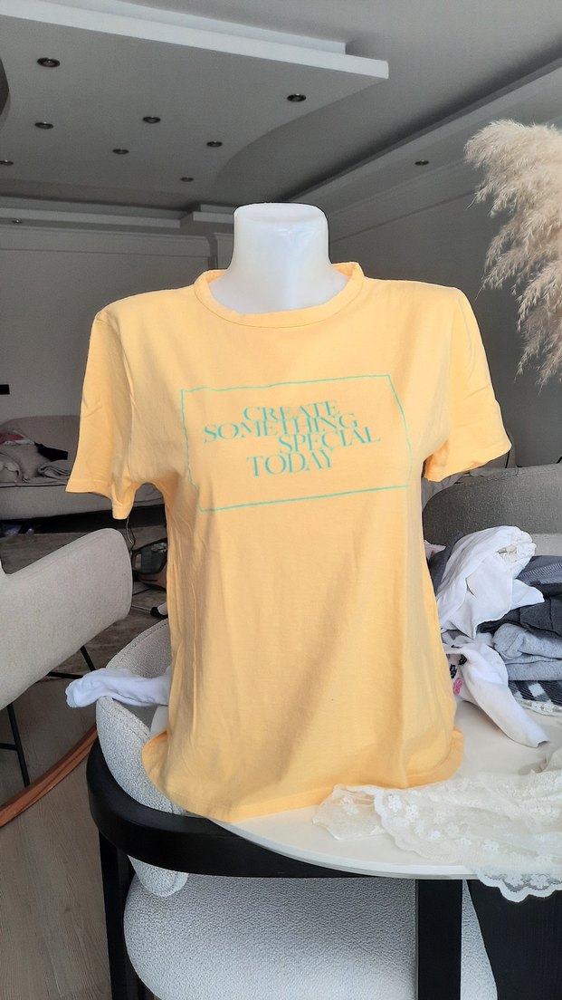 Pastel sarı pamuklu tişört, salaş kesim ve kısa kolludur. Baskılı ve yuvarlak yakalı, günlük kullanıma uygun rahat bir modeldir.