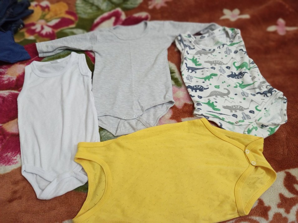 Sarı renkli, pamuklu, kolsuz ve yuvarlak yakalı bebek body. beyaz yeni giyilmedi sarı birkez giyildi yeni sayılır gri temiz diğer kısa kollunn yakadas da belirttim resimde küçük leke var yirtk sökük yok