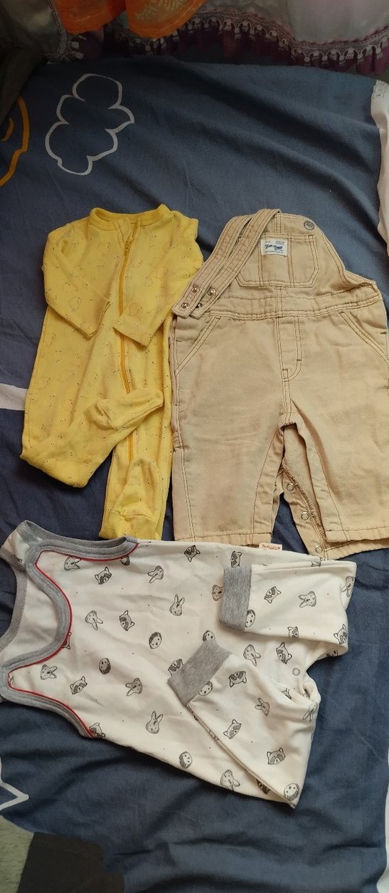 Sarı pamuklu kolsuz tulum, bej askılı pantolon ve gri-beyaz desenli uzun kollu zıbından oluşan bebek erkek kıyafet seti. Rahat ve sade tarz. bir defa kullanılmış 6 aylık dan tulum 1.5 yaş olur orjinal ürün