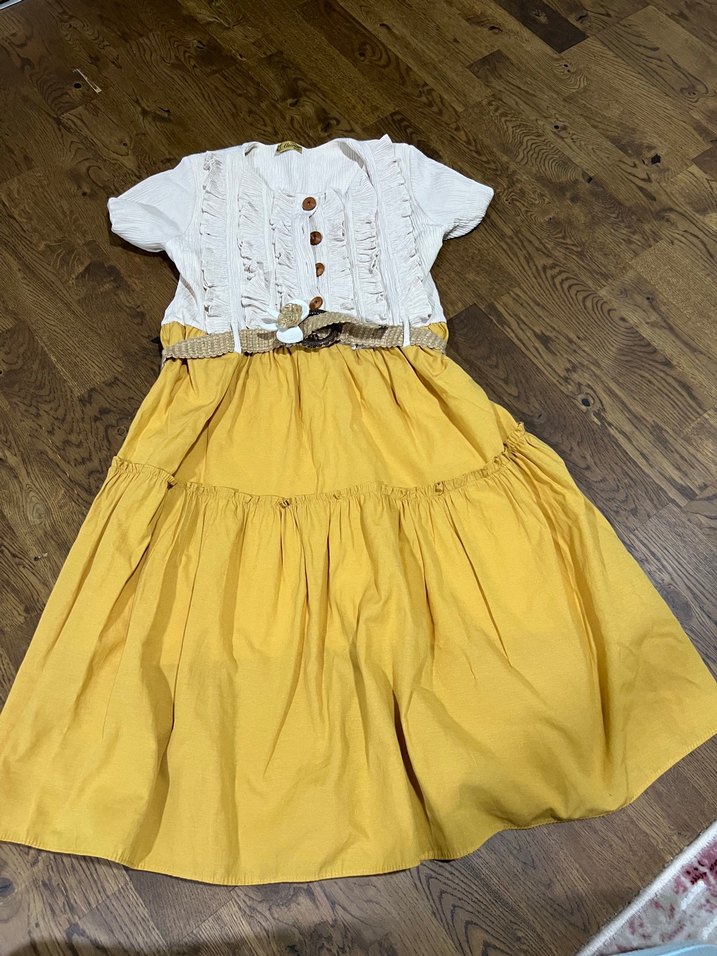 Pamuklu, bol kesim, askısız ve kısa kollu kız elbisesi. Sarı pastel renkte, bohem ve retro tarzda fırfırlı detaylar içerir. 14 yaş tertemiz ve sayılı giyilmiştir