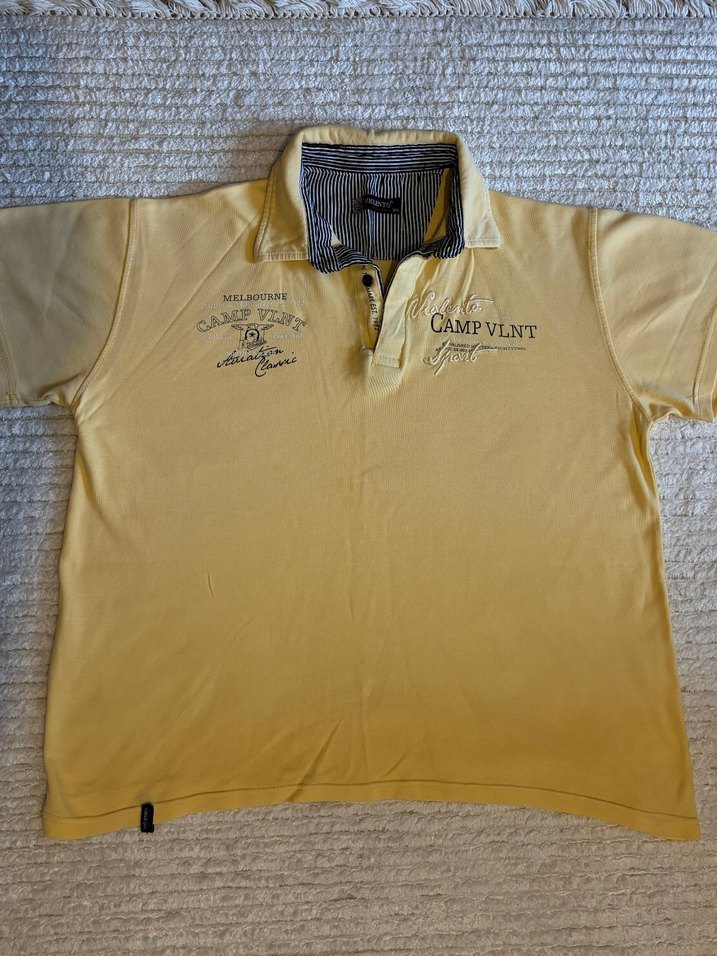 Sarı pamuklu, kısa kollu, yakalı ve düğmeli erkek polo tişört. CAMPVLNT nakış detaylı, rahat kesim, günlük kullanım için uygun.