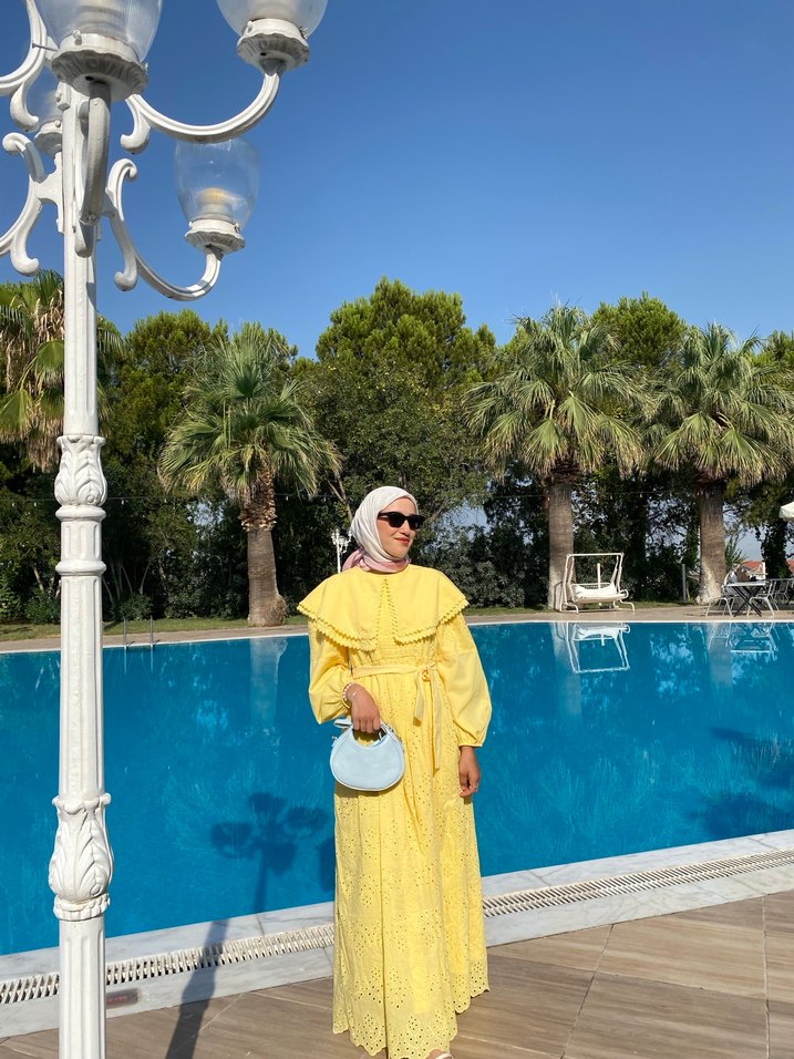 Yüksek yakalı, uzun kollu, pamuklu sarı salaş elbise. Drapeli tasarım ve hafif batik deseniyle günlük kullanıma uygun.