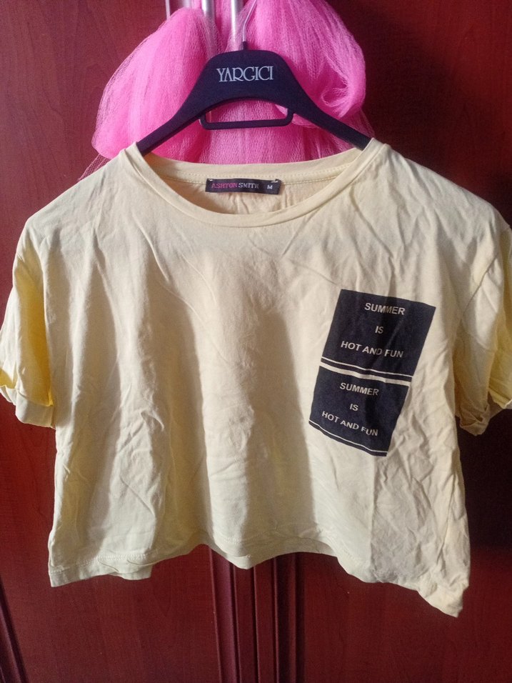 Sarı pamuklu tişört, kısa kollu ve bol kesimdir. Rahat ve günlük tarzda bir üründür.