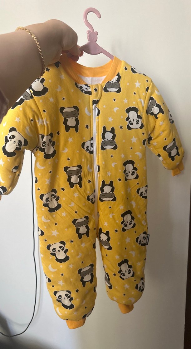 Sarı tabanlı, renkli panda desenlerine sahip yumuşak ve sıcak bir kumaştan yapılmış bebek uyku tulumu. Önünde kolay giydirme için fermuar bulunur. Ayaksızdır ve defosu yoktur