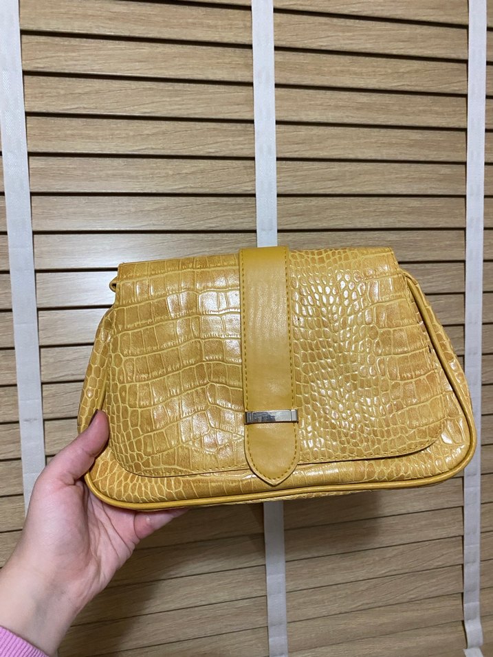 Sarı parlak deri, yılan desenli ve tokalı kapamalı modern klasik tarzda kadın çanta.