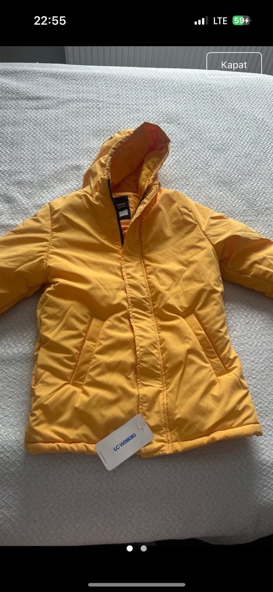 Sarı parlak renkte, kapüşonlu, fermuarlı ve kesimli erkek çocuk montu. Yumuşak ve sıcak kumaştan, trend sokak stili için uygundur.