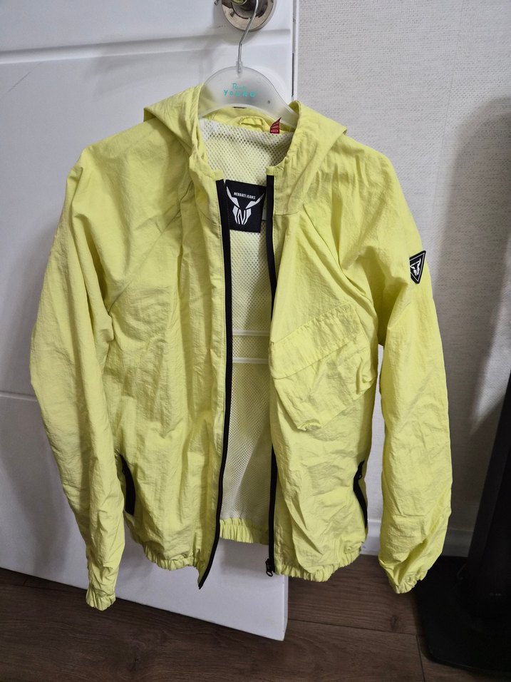 Sarı parlak renkte, fermuarlı ve uzun kollu, notched lapel yakalı, sentetik kumaştan yapılmış, günlük kullanıma uygun dar kesim sokak stili erkek çocuk yağmurluk